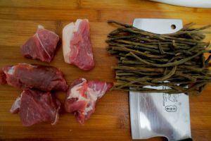 后腿肉洗净改刀1.5厘米方块,干豆角泡好洗净切段,凉水泡20小时,温水4小时。可以增香去腻。