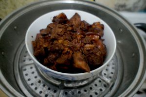 取蒸锅加足水烧开。去一大碗干豆角铺底,把肉码在上面,倒入汤汁没过干豆角。大火上锅蒸1小时。即可