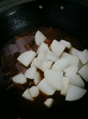 焖一个小时后加入白萝卜,喜欢吃土豆也可以换成土豆。