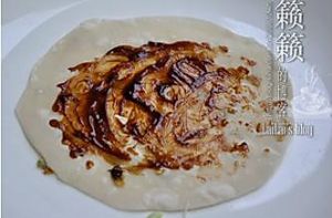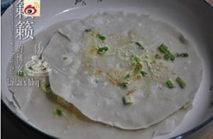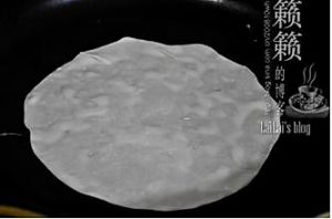 烙至面片表面微干,面皮稍稍鼓胀时翻面,将葱末蛋液涂刷面皮上,待蛋液凝固时将面皮再翻个面烙一会起锅备用;(呵呵,鄙视我吧,我烙的饼总比自己想像中的要更不薄)