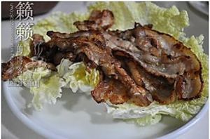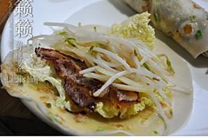 将腩肉煎至双面焦香金黄时出锅;大白菜浸泡洗净拭干水分取菜叶部分备用;绿豆芽洗净摘除头尾,锅内炒至断生备用;将鸡蛋打散,调入少许盐、糖(利于蓬松)、胡椒粉搅匀,小葱洗净切末放入蛋液中搅匀;(还剩了点小肉末也放进去了)