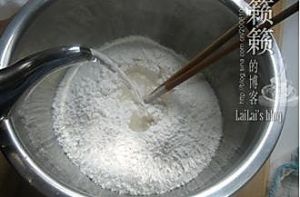 将面粉放入盆中加入少许盐拌匀,往面粉中冲入温度85℃-100℃的沸水,边倒边用筷子快速搅成雪花片状,
