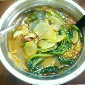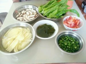 把买的,马铃薯切成薄片,辣椒切成段,番茄海带都切,香菇切成片,青菜随便的,自己喜欢吃什么青菜都可以,然后切蒜末姜末,倒少许油放入蒜末姜末,然后先抄辣椒,土豆片,香菇片,海带,然后放水稍微盖住土豆片就可以,然后在放味精调料等,都要按照个人口味,煮到土豆片熟了,放醋闷一分钟,根据个人口味的哦