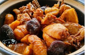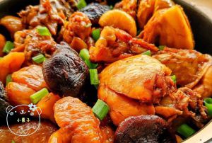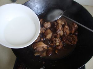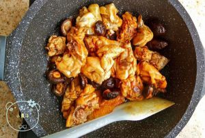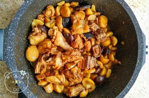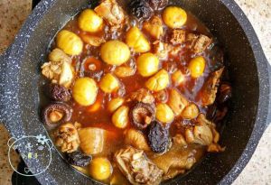 最后倒入板栗,加入适量的开水(预先煮好,煮水时也可以混入香菇水,味道会更香)和食材差不多持平。大火烧开后转小火盖上锅盖,炖煮20多分钟,视板差不多软就可以了
