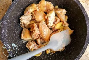 底油爆香葱姜,加鸡腿炒变色,炒出水汽