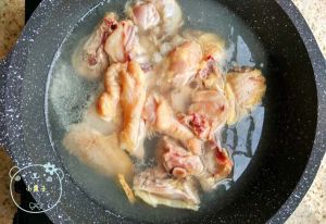 锅中放水烧开后,放入姜片,将土鸡块放入锅中焯水后捞出备用