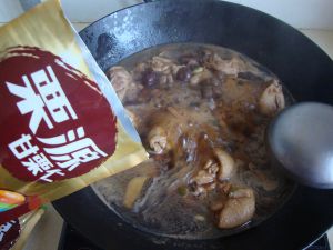 再放入炒好的板栗及所有调味料及鸡汤1杯;大火煮开后,转小火盖上锅盖煮制,直至水份快收干。