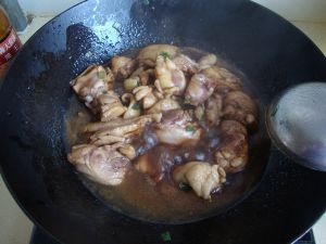 当鸡块表面金黄色,肉质明显缩小。倒入料酒1大匙煮至干。