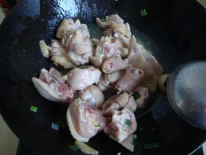 剩下的油,放入姜片及大蒜爆香。放入鸡块,翻炒。