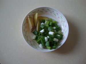 葱姜改刀,鸡腿块洗净,淀粉加水调开备用