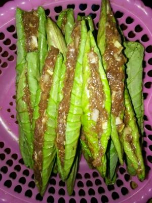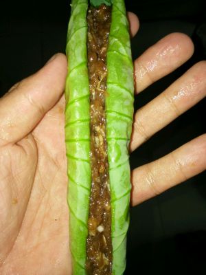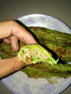 鲜荷叶去蒂洗净,用刀在每张荷叶中间划一十字,分成四块,再用开水烫洗一下。每块荷叶(绿面朝下)包一条面筋,码在盘中,上展蒸约20分钟取出,原包摆在盘内即成。均用一片荷叶包好,排列在碗内入笼蒸熟,取出摆入盘内即成。