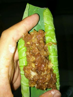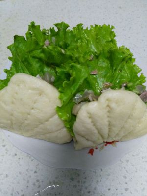 发好的面~和蒸馒头发面过程一样,切成小块,每块擀成椭圆,将椭圆面片对折如图,中间刷油,用牙签压出荷叶叶脉并扎孔~~上锅蒸熟~