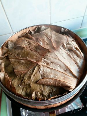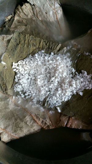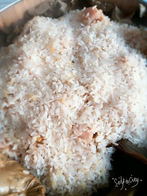 蒸屉上铺好荷叶把泡好的米和花肉拌匀,(香菇切片可加可不加)