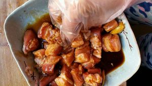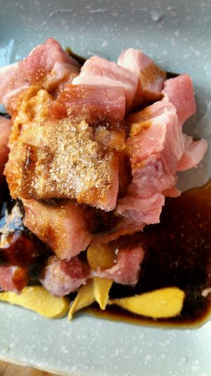 花肉切丁,加入酱油,耗油,葱花,姜片,料酒,糖