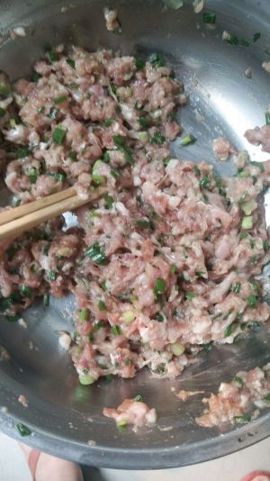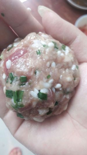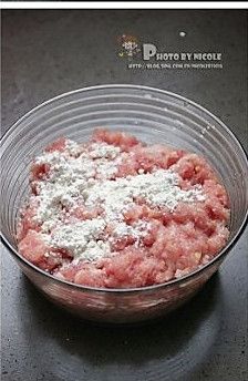 将肉剁碎,同时加入调料:葱,蒜,黄酒,鸡精。这样容易入味