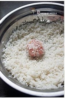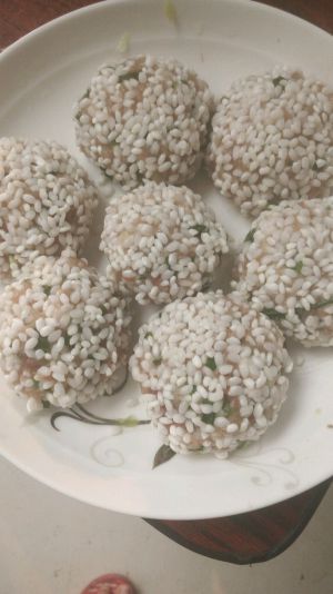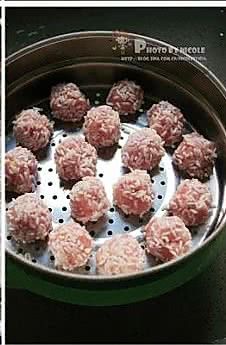 将肉揉成肉圆,外表裹上糯米,隔水蒸即可~