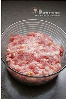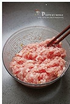 肥瘦相间的猪肉与姜一起剁成肉馅;