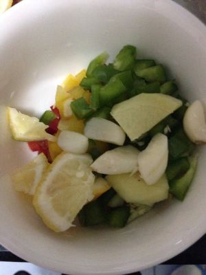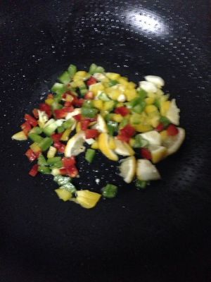 红椒、青椒、黄椒切丁,蒜姜切片,葱花,备用