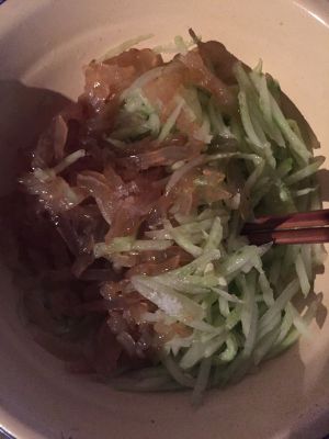 海蜇泡好后切丝,黄瓜刨丝。加一勺白糖,一小撮味精。海蜇本身咸的所以盐不用放了。再加点醋。喜欢酸的多放,不喜欢的少放。根据自己口味放调料。拌下就可以上桌吃了。很简单吧……