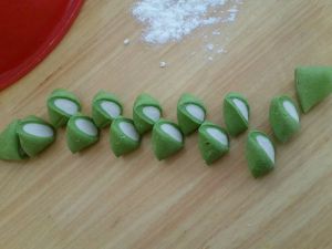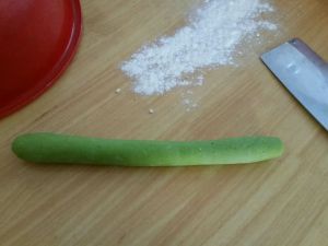 第一步:将洗好的菠菜切碎打成汁。 第二步:先揉白面。 第三步:将打好的菠菜汁和面混合揉成菠菜面。 第四步:将白面揉成条,将菠菜面擀成皮包住白面。(如图)