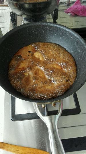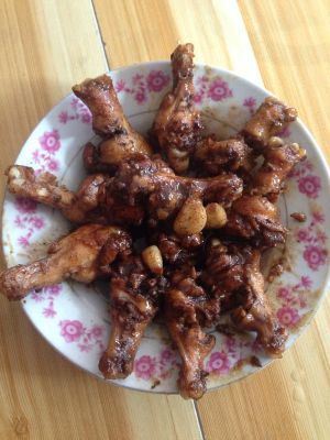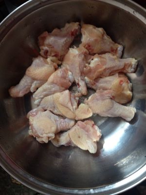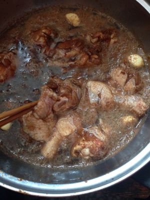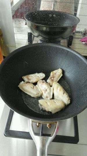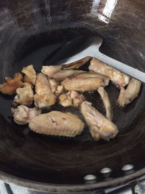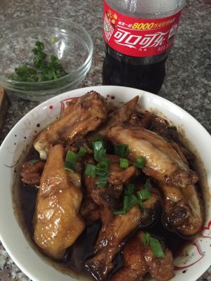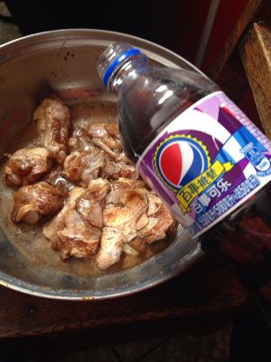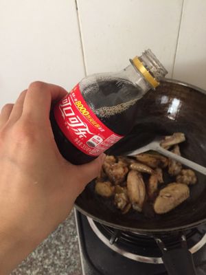 重新倒入油,姜、葱炝锅,再放入鸡翅,倒入可乐直至盖住鸡翅,大火熬制,小火收汁。