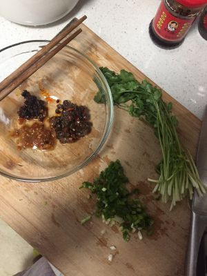 把粉丝洗一下,放入锅内煮。煮在那里的时候准备料。两种酱一种辣椒酱一种豆豉的酱放在碗里,加入葱、少许盐、生抽、很多很多醋。香菜备用。