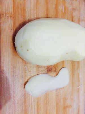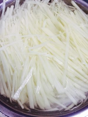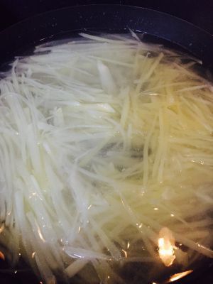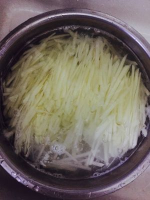 刨好的土豆用清水冲洗三遍,滤掉浮于表面的淀粉。