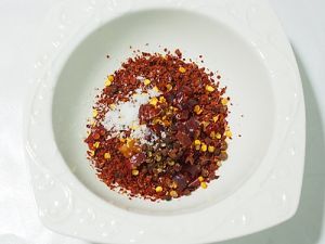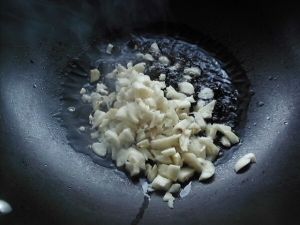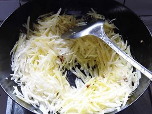 土豆丝翻炒至半透明状(大约1分钟,量大约2分钟),加辣椒和蒜末,加盐,加两勺醋,继续翻炒。