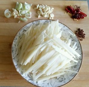 热油炒葱姜蒜干辣椒 爆出味道 加土豆丝 翻炒1min 起锅调味。 上火迅速翻炒至均匀关火