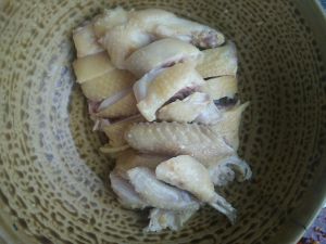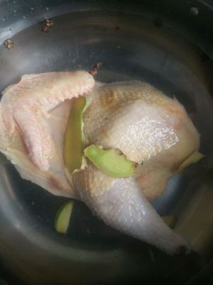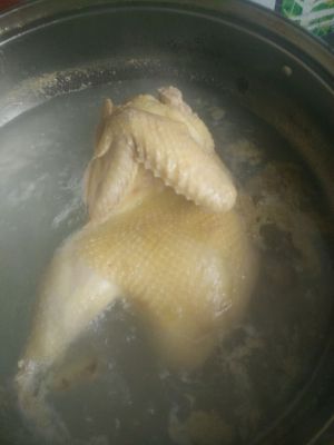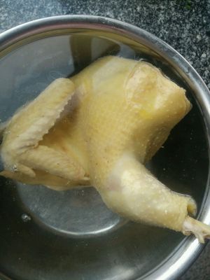 水烧开,将鸡和生姜,葱炖五分钟,然后关火焖十五分钟断生,然后捞出放冰水里面。