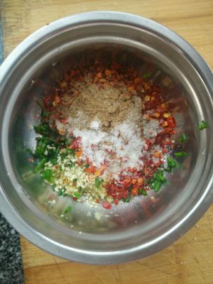 食用盐,鸡精蒜泥辣椒粉放碗里备用