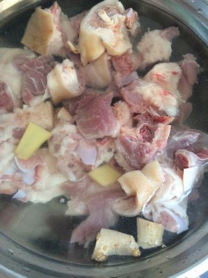 买猪蹄的时候让老板帮忙切好了,洗一两次以后放水里焯,水里放姜片,料酒去味儿