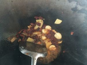然后放糖,放豆瓣酱,炒出豆瓣酱香味