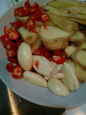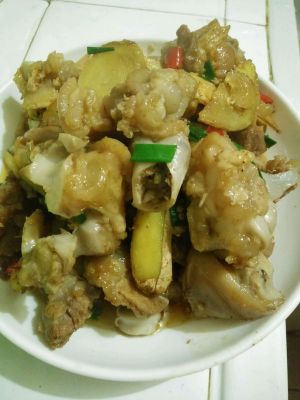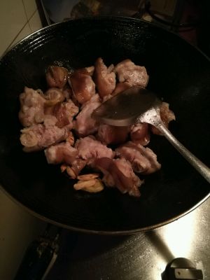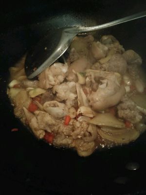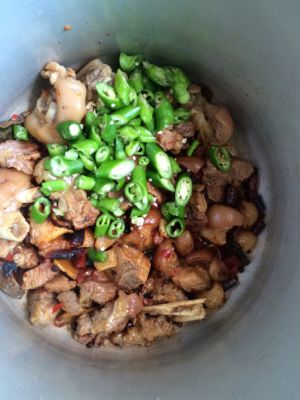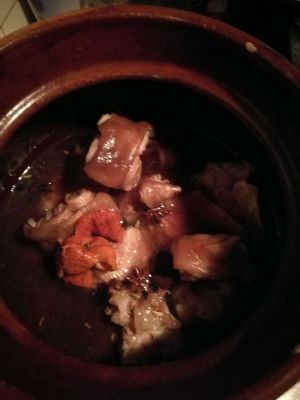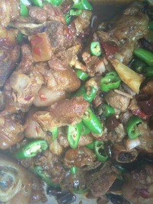 抄出一定的油脂的猪蹄,倒入砂锅,放入草果,八角,陈皮,葱,生抽,4碗水,一杯红酒,煮一个半小时。然后放入辣椒,耗油,再煮一个小时。