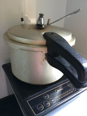 然后加水至猪蹄齐平,倒入酱油和料酒,煮沸,全部倒入高压锅,压20分钟