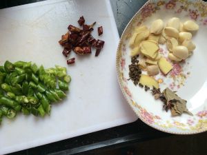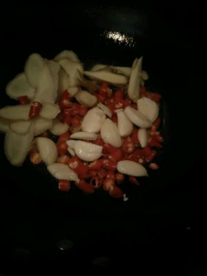 准备好这些,盘子里先下锅炒香,然后放红辣椒