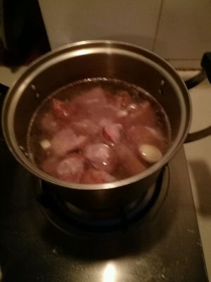 猪蹄焯水,用姜,蒜,葱一起煮,放盐,放料酒。