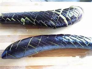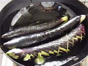将茄子洗净,象切鱼一样给茄子正反面打花刀。