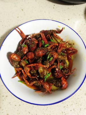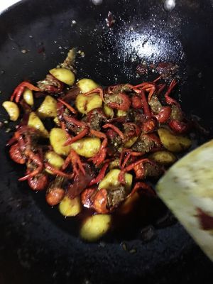 留底油,放花椒、辣椒油、八角桂皮、葱姜蒜,炒香(这一步没拍到),炒香后放炸好的小龙虾,炒匀,大概几分钟后放高汤或热水(我直接放的热水)