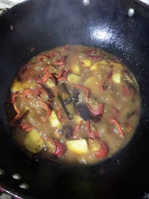 焖煮后转大火不停翻炒,倒入辣椒油,生抽,少许老抽,起锅时倒入少许香醋。