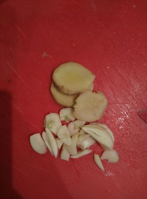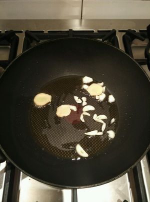 锅里放少许油加热,把姜和蒜放进去,煸炒出香味