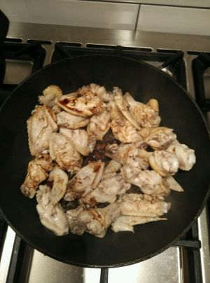 放鸡翅,翻炒(这个步骤也可以直接放生鸡翅煸炒,看个人喜好)倒入少许酱油,调色