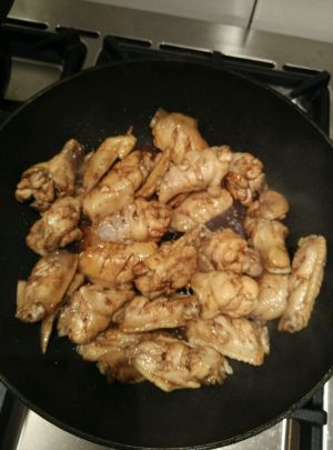 炒锅倒油,把鸡翅放入锅里煎一下(用筷子夹进去哦,可不能把腌的料汁也倒进去哦!会很咸的。)