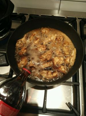 倒入可乐,中火炖之(可乐没过鸡翅就可以)。不要离开呦,以防糊锅,最后大火收汁就可以了。