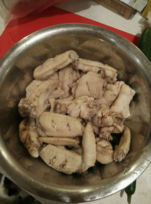 一公斤整鸡翅,对照关节部位切成三段,在给每一个翅膀上划两刀,然后放进热水里煮一会,把生肉里面的血煮出来就可以了