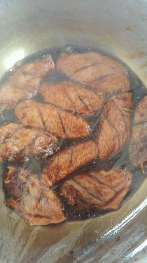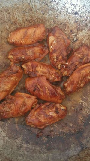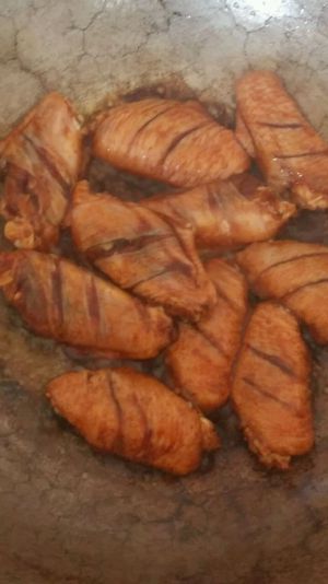 将腌好的鸡翅放入锅中,倒半瓶可乐,直至熬干