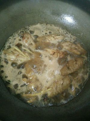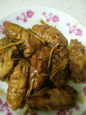沥干后在锅里放入少许油,等有稍有些热就下鸡翅炸至变色,倒入生抽,可乐,翻炒均匀放入姜丝。