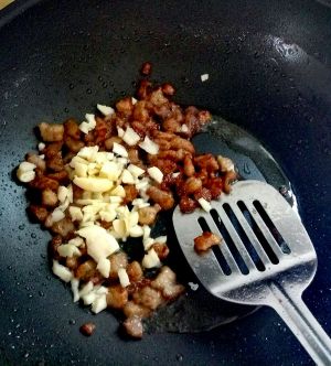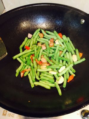 猪肉至金黄色时➕四季豆➕蒜头➕辣椒