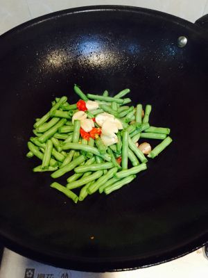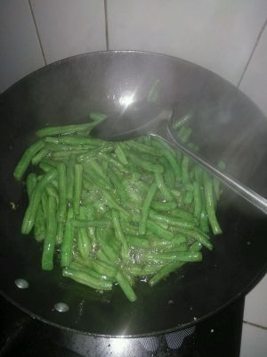 锅里加入适量油,锅里冒青烟时加入芽菜,炒香,在加入姜蒜花椒,辣椒段,炒香,在倒入四季豆翻炒一会,最后加入盐味精