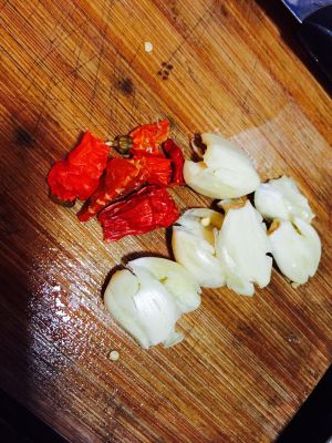 蒜头拍碎,准备好干辣椒和花椒粒,已经郫县豆瓣酱